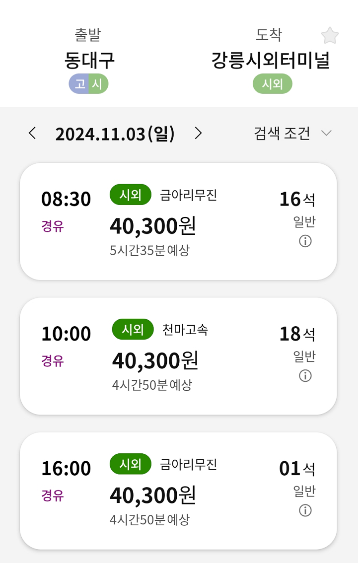 예를 들어 청주에서 강릉으로 선택하셨다면 하루동안의 배차는 5번이며, 요금과 잔여좌석, 노선정보까지 확인할 수 있습니다.